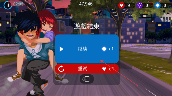 4、若游戲結(jié)束,出現(xiàn)遊戲結(jié)束界面,點(diǎn)擊繼續(xù)消耗鉆石續(xù)關(guān),或點(diǎn)擊重試重新開始游戲。