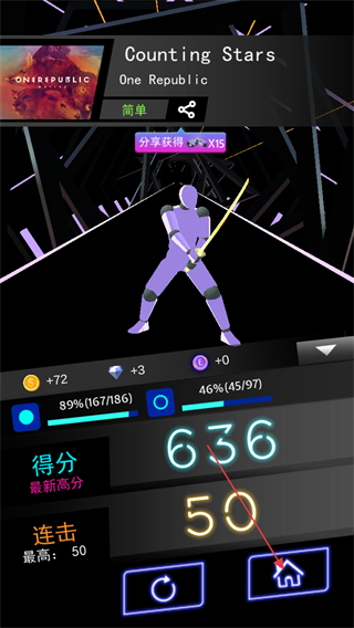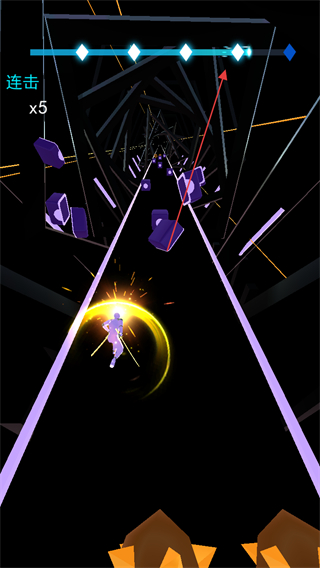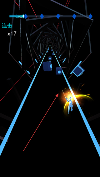 2、按照方塊飛來的方向和角度,點(diǎn)擊屏幕操控角色揮劍擊打方塊,獲取連擊數(shù)如連擊x17。