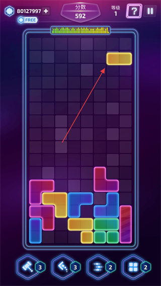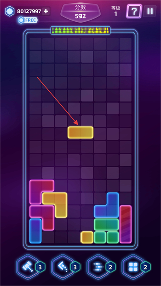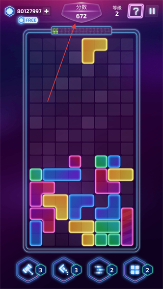 1、進(jìn)入游戲,查看屏幕上方的分?jǐn)?shù),等級(jí),觀察掉落的彩色方塊,選擇合適位置放置。