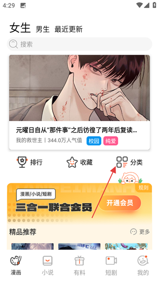 1、進(jìn)入漫畫屋,在首頁點(diǎn)擊分類,進(jìn)入分類選擇頁面。