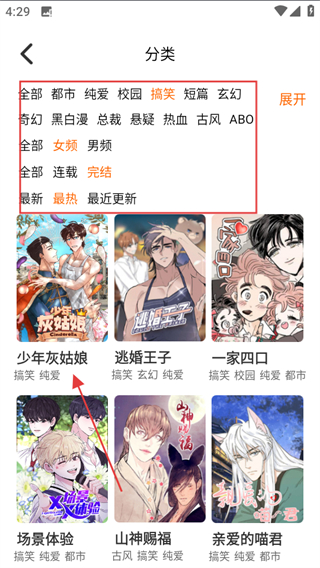 2、在分類選擇頁面,篩選出感興趣的分類,點(diǎn)擊感興趣的漫畫進(jìn)入。