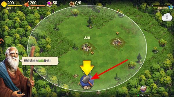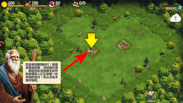 1、選擇建設(shè)起點(diǎn),點(diǎn)擊提示的木堆區(qū)域,確定文明建設(shè)的初始地點(diǎn),開(kāi)啟部落的建設(shè)進(jìn)程。