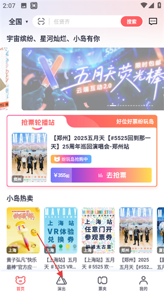 1、進(jìn)入紛玩島,在首頁點(diǎn)擊底部演出,進(jìn)入演出頁面。