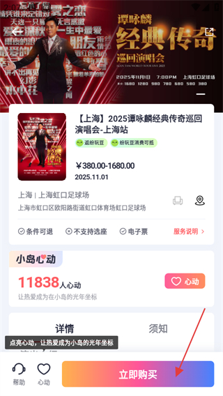 3、在演出詳情頁,點(diǎn)擊立即購買,進(jìn)入票品選擇頁面。