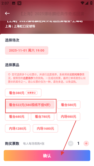 4、在票品選擇頁面,選擇好信息后,點(diǎn)擊確認(rèn),進(jìn)入訂單確認(rèn)頁面。
