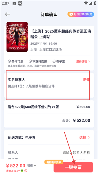 5、新增實(shí)名持票人,確認(rèn)訂單信息無誤后,點(diǎn)擊一鍵搶票,完成搶票操作。