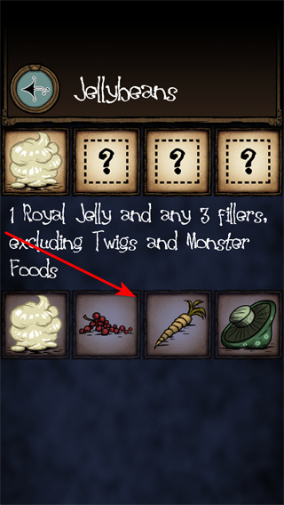 3、制作Jellybeans配方,按照配方要求,使用1份Royal Jelly和3份非樹枝、非怪物食物的填充物。
