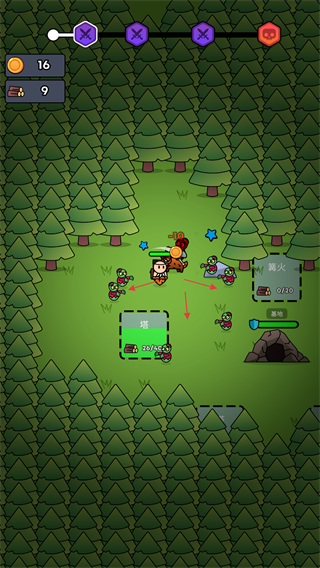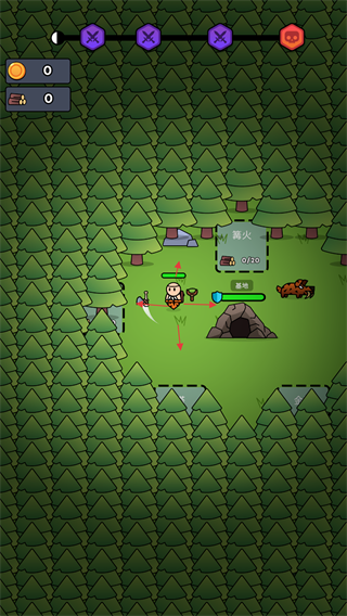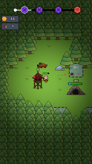 1、在森林地圖中探索,收集金幣和木材,同時(shí)留意篝火、基地等設(shè)施,保障冒險(xiǎn)進(jìn)程。