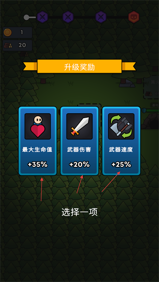 2、升級(jí)時(shí)選擇獎(jiǎng)勵(lì),強(qiáng)化自身能力,提升戰(zhàn)斗與生存實(shí)力。