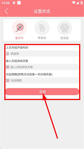 3、選擇上次月經(jīng)開始時間、輸入月經(jīng)持續(xù)天數(shù)和月經(jīng)周期后,點擊完成,完成狀態(tài)設(shè)置。