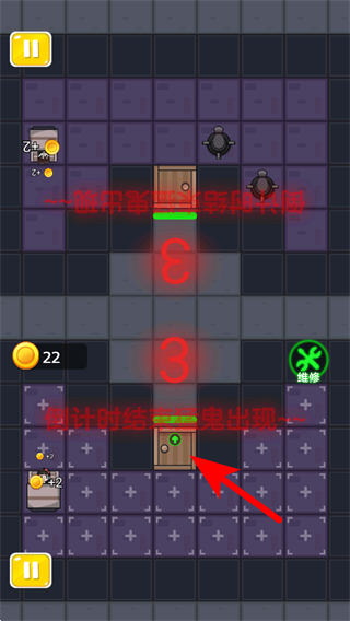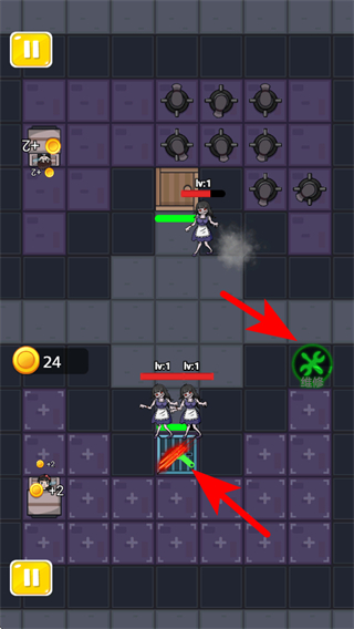 3、敵人出現(xiàn)后,點(diǎn)擊維修道具可修復(fù)受損建筑,同時(shí)持續(xù)升級(jí)防御建筑,對(duì)抗不斷出現(xiàn)的敵人,保障防御陣線的穩(wěn)固。