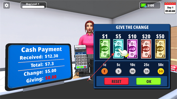 3、根據(jù)應(yīng)收金額和顧客支付金額,計算找零數(shù)額,在GIVETHECHANGE界面選擇對應(yīng)面額鈔票找零,點擊OK確認。