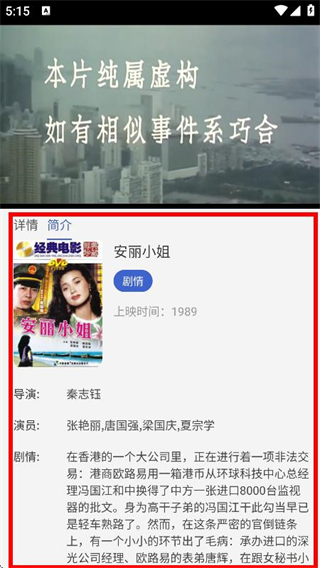 3、在電影詳情頁面,可查看安麗小姐的上映時間、導演、演員及劇情等信息。