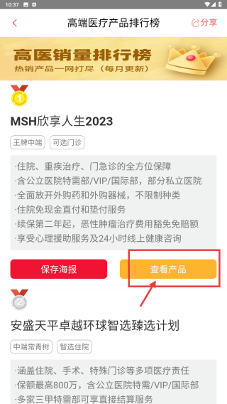3、在高端醫(yī)療產(chǎn)品排行榜中,點擊MSH欣享人生2023的查看產(chǎn)品按鈕,進入產(chǎn)品詳情頁。