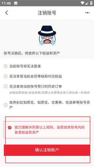 4、在注銷賬號說明頁面,同意規(guī)則后,點(diǎn)擊確認(rèn)注銷賬戶,進(jìn)入驗(yàn)證頁面。