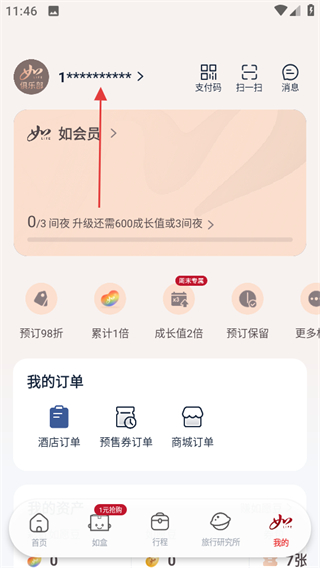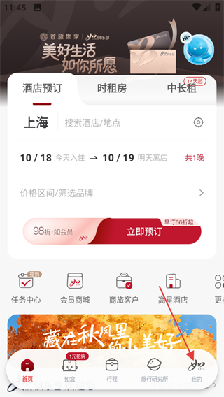 1、進(jìn)入首旅如家,在首頁點(diǎn)擊底部我的,進(jìn)入個(gè)人頁面。
