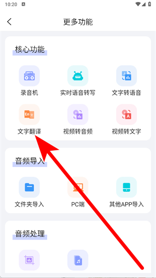 3、在更多功能頁(yè)面,點(diǎn)擊文字翻譯選項(xiàng)進(jìn)入翻譯頁(yè)面。