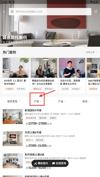 2、在整租案例頁面,點擊戶型標簽,展開戶型篩選選項。