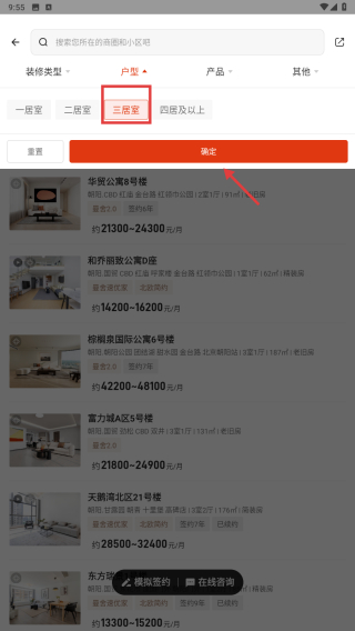 3、在戶型篩選選項中,勾選三居室,點擊確定按鈕,篩選出三居室房源。