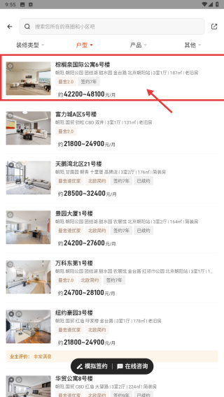 4、在三居室房源列表中,選擇棕櫚泉國際公寓6號樓房源,點擊進入詳情頁查看信息。