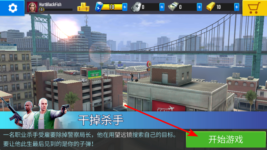 1、開(kāi)始任務(wù)挑戰(zhàn),點(diǎn)擊開(kāi)始游戲按鈕,進(jìn)入干掉殺手的任務(wù)場(chǎng)景,開(kāi)啟狙擊任務(wù)的冒險(xiǎn)之旅。