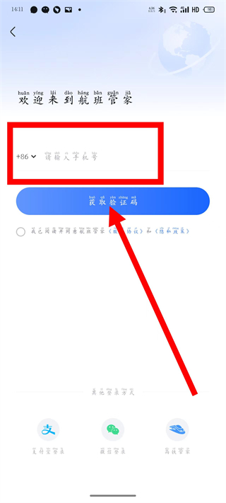 3、在登錄頁面,輸入框中填寫手機(jī)號碼,勾選后,點(diǎn)擊獲取驗(yàn)證碼。