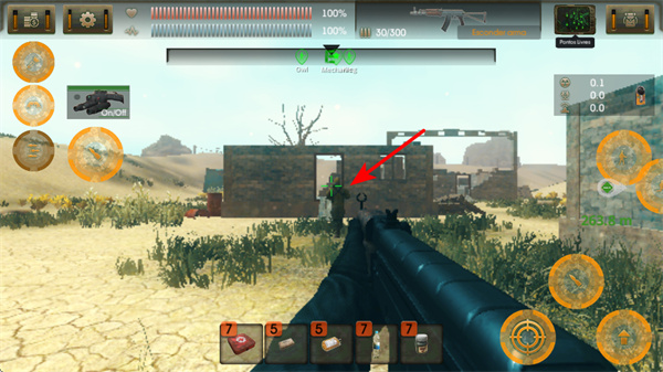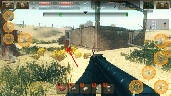 4、場景探索引導(dǎo)則拓展了游戲的深度,紅色箭頭指向場景中的資源點如紅色箱子,通過拾取這些資源點的彈藥,能補充戰(zhàn)斗消耗。