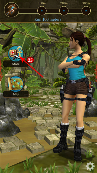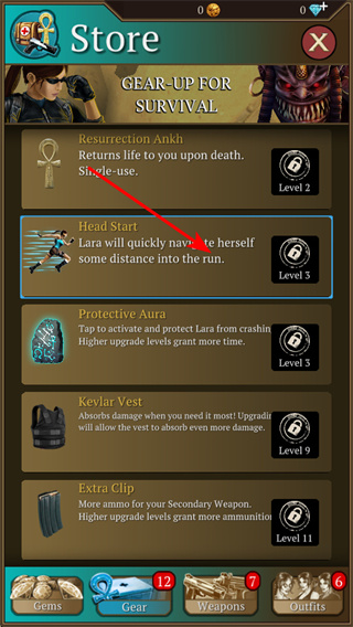 2、道具作用引導緊隨其后,進入商店后,紅色箭頭指向Head Start道具,說明該道具能讓勞拉在奔跑中快速前進一段距離。