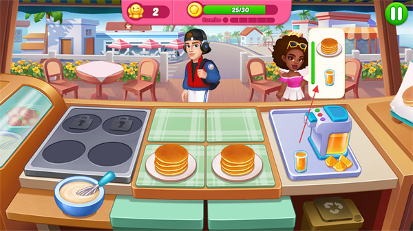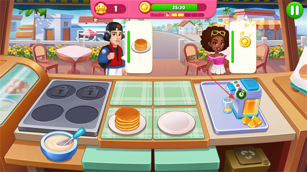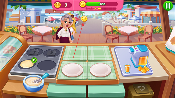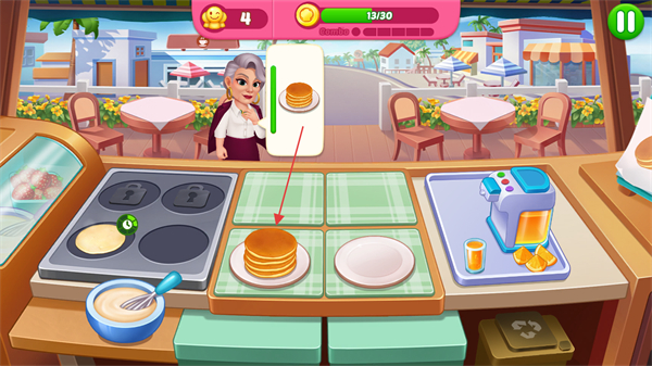 1、進(jìn)入游戲,關(guān)注屏幕上方顧客頭上的食物需求標(biāo)識(shí),比如煎餅,點(diǎn)擊灶臺(tái)制作相應(yīng)食物。