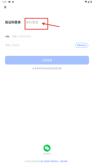 3、在登錄選擇界面,點擊密碼登錄選項,進入密碼登錄頁面。