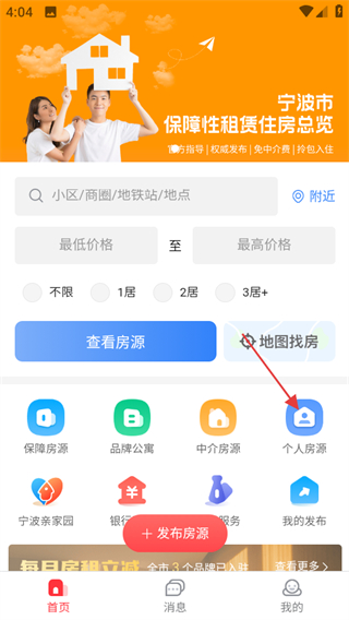 1、打開寧波租房,點(diǎn)擊個(gè)人房源,可進(jìn)入個(gè)人房源板塊。