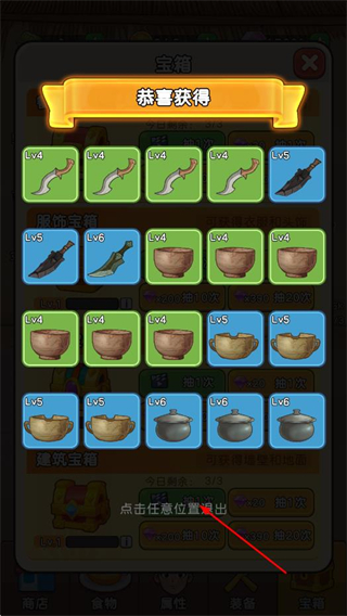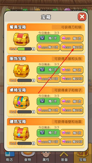 設(shè)置了多樣的寶箱抽取機制,有餐具寶箱、服飾寶箱、桌椅寶箱、建筑寶箱等不同類型的寶箱,每次抽取都有機會獲得高級裝備,這種隨機性增加的趣味性和期待感。