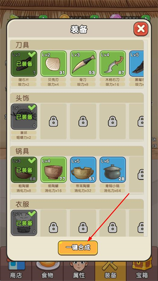 4、點擊下方裝備按鈕,進入裝備界面,已擁有的裝備會顯示在這里,點擊一鍵合成來合成更高級的裝備。