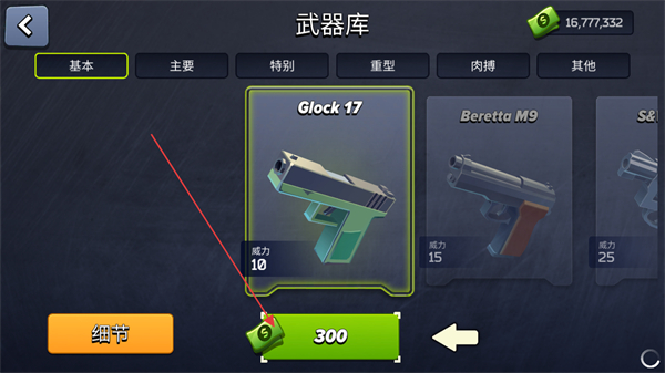 4、進(jìn)入武器庫(kù),花費(fèi)資源購(gòu)買(mǎi)Glock17等武器,增強(qiáng)火力,繼續(xù)突襲僵尸。