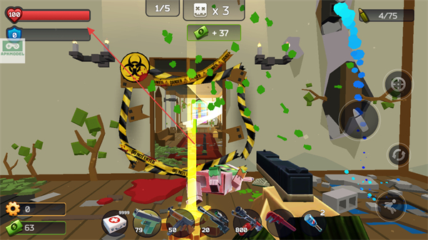 2、擊殺僵尸后可獲得金幣獎(jiǎng)勵(lì),積累金幣用于升級(jí)或購(gòu)買道具。