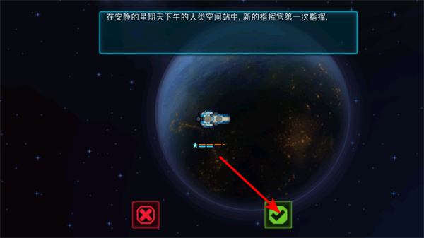 2、在太空指揮場(chǎng)景中,點(diǎn)擊綠色對(duì)勾按鈕,這是確認(rèn)指揮指令的核心步驟,準(zhǔn)確點(diǎn)擊可推進(jìn)劇情,開啟首次太空任務(wù)。
