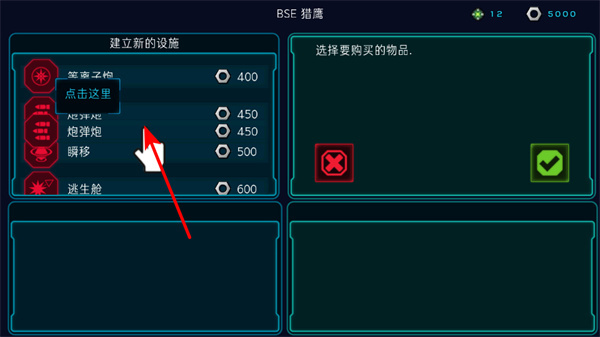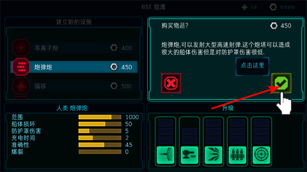 1、進(jìn)入設(shè)施購(gòu)買界面后,點(diǎn)擊炮彈炮等設(shè)施選項(xiàng),這是提升飛船戰(zhàn)力的關(guān)鍵操作,可選擇需購(gòu)買的設(shè)施類型。