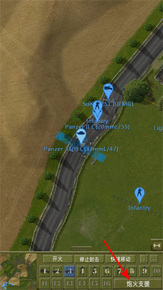 1、進(jìn)入戰(zhàn)斗界面后,點(diǎn)擊炮火支援按鈕,這是發(fā)起火力壓制的關(guān)鍵操作,準(zhǔn)確點(diǎn)擊可對(duì)敵方區(qū)域?qū)嵤┡诨鸶采w,削弱敵方戰(zhàn)力。