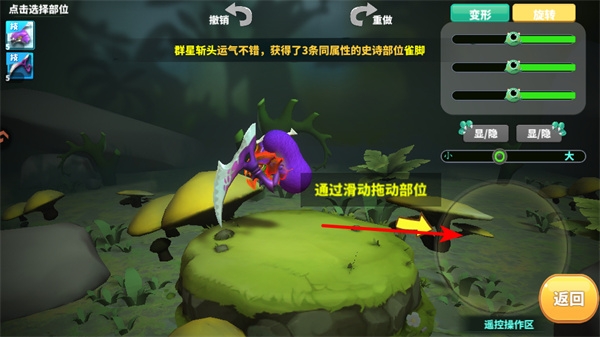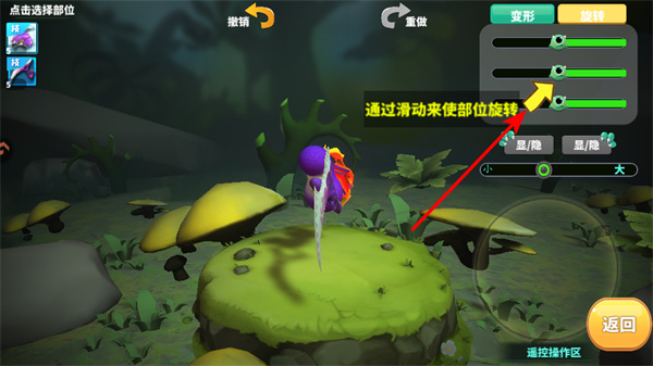 2、點(diǎn)擊滑動(dòng)旋轉(zhuǎn)條來使部位旋轉(zhuǎn),這是精細(xì)調(diào)整生物部位的核心操作,旋轉(zhuǎn)后可讓部位角度更適配戰(zhàn)斗需求,增強(qiáng)攻擊或防御效果。