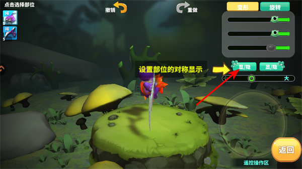 3、設(shè)置部位的對(duì)稱顯示時(shí),點(diǎn)顯/隱按鈕,這是調(diào)整生物外觀對(duì)稱性的關(guān)鍵步驟,操作后可讓生物部位對(duì)稱顯示,提升整體造型合理性。