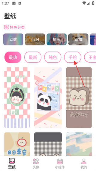 1、打開百變美化主題,點(diǎn)擊手繪分類,可進(jìn)入手繪壁紙列表頁面。
