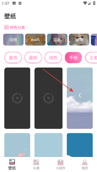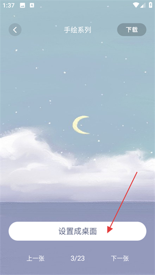 2、在壁紙列表頁面,點(diǎn)擊心儀壁紙如帶有月亮云朵的手繪壁紙,可進(jìn)入壁紙詳情頁面。