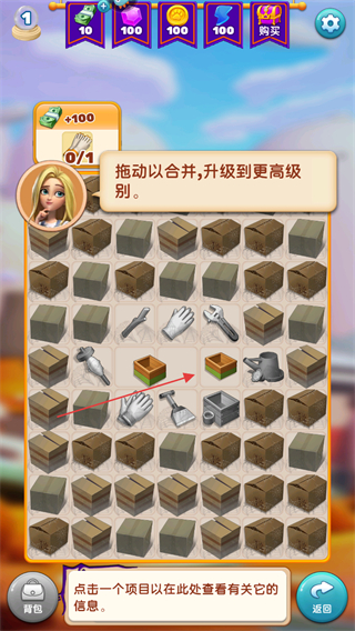 1、游戲為不斷合成相互消除的類型,通關(guān)拖動相同物品使之合成變成更高級的物品。