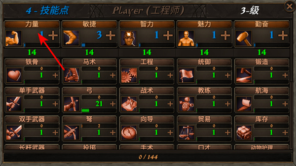 2、在技能點(diǎn)分配界面,可點(diǎn)擊力量屬性旁的+號,提升角色力量屬性,增強(qiáng)角色的戰(zhàn)斗或生存能力。