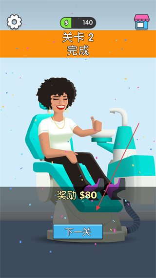 4、關(guān)卡完成,獲得金幣獎(jiǎng)勵(lì),點(diǎn)擊下一關(guān)繼續(xù)為新患者治療牙齒。
