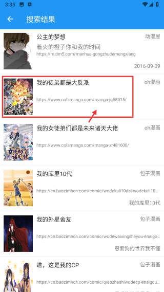 3、在搜索結(jié)果中,點(diǎn)擊我的徒弟都是大反派條目,進(jìn)入漫畫(huà)詳情頁(yè)。