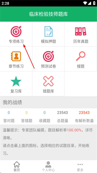 1、打開臨床檢驗(yàn)技師題庫(kù),點(diǎn)擊專項(xiàng)練習(xí),可進(jìn)入專項(xiàng)練習(xí)分類頁(yè)面。