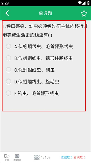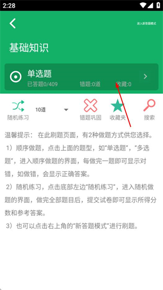 3、在基礎(chǔ)知識(shí)題型選擇頁(yè)面,點(diǎn)擊單選題可進(jìn)入單選題答題界面。