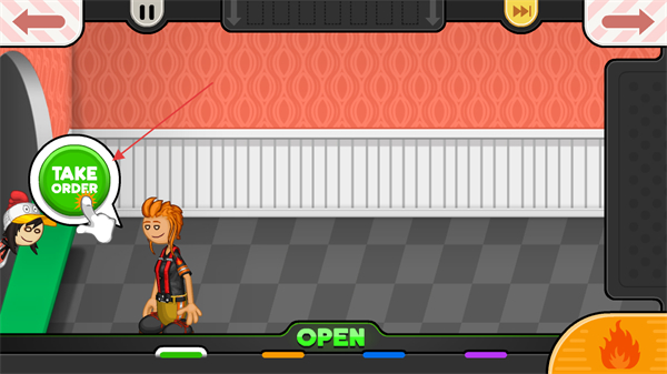 1、進(jìn)入游戲開始營(yíng)業(yè),點(diǎn)擊綠色按鈕開始記錄排隊(duì)顧客需求生成菜單。