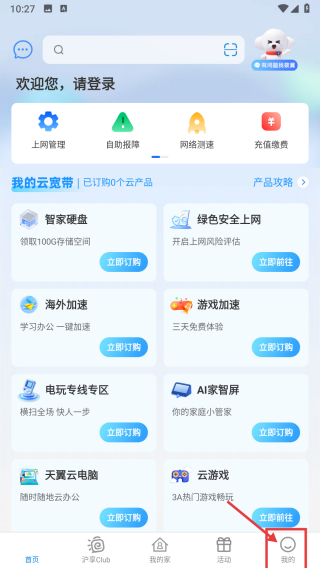 1、打開電信云寬帶APP首頁,點擊底部我的選項,進入個人中心頁面。